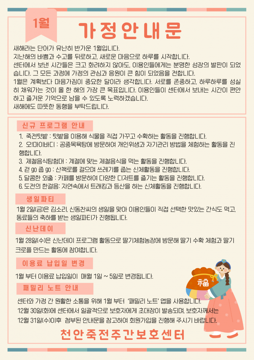 2026년 1월 가정안내문 페이지 정보 작성자 김미리 작성일26-01-05 14:44 조회581회 댓글0건 이전글 다음글 목록 본문 2026년 1월 가정안내문 입니다. 댓글목록 등록된 댓글이 없습니다. 이전글 다음글 목록