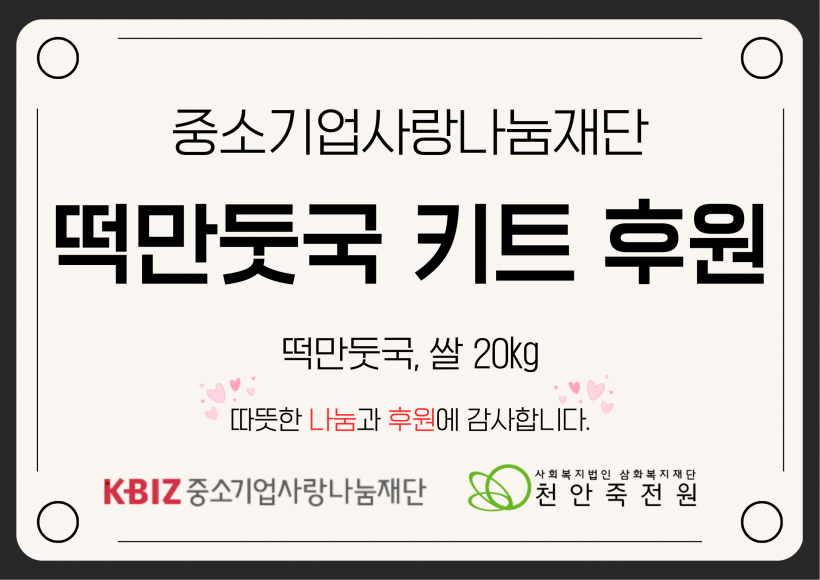 중소기업사랑나눔재단 떡만둣국키트, 쌀 후원 페이지 정보 작성자 운영자 작성일26-02-05 13:45 조회228회 댓글0건 관련링크 목록 본문 26.01.28.(수)중소기업사랑나눔재단 떡만둣국키트, 쌀 후원해주셨습니다.가족분들도 환하게 웃으시면서 맛있게 식사 하셨습니다.천안죽전원에게 사랑과 나눔을 해주신 중소기업사랑나눔재단에게 다시한번 감사의 말씀을 드립니다.감사합니다. 댓글목록 등록된 댓글이 없습니다. 목록