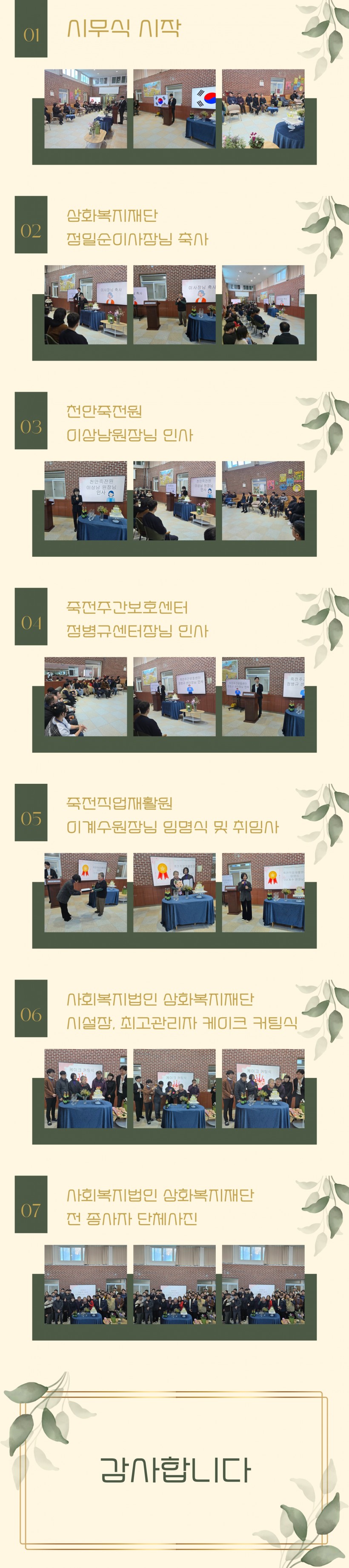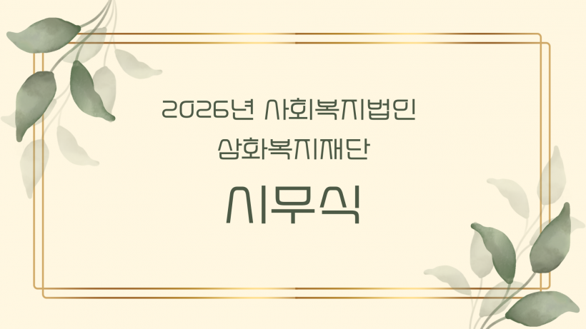 2026년 사회복지법인 삼화복지재단 시무식 페이지 정보 작성자 운영자 작성일26-01-02 17:56 조회395회 댓글0건 관련링크 목록 본문 2026년 사회복지법인 삼화복지재단 시무식 진행하였습니다.2025년 잘 마무리 진행하였고 새롭게 2026년 시작하였습니다.2025년에 사랑과 나눔, 후원, 봉사를 진행해주신 모든 분들께 감사드리며 2026년에도 잘 부탁드립니다.새해 복 많이 받으세요! 댓글목록 등록된 댓글이 없습니다. 목록