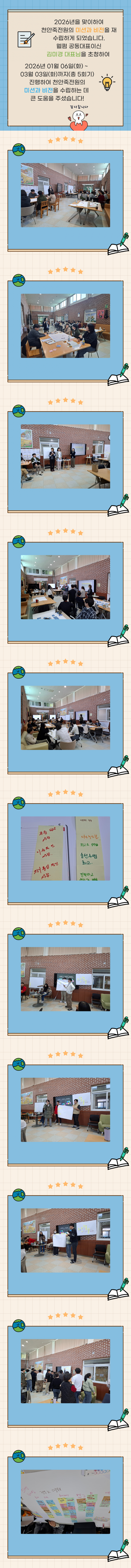 미션&비전 교육 페이지 정보 작성자 운영자 작성일26-03-16 16:16 조회15회 댓글0건 관련링크 목록 본문 2026년 01월06일 부터 03월 03일까지 미션,비전 교육 진행하였습니다.기관에 대한 정체성과 직원분들의 장점, 업무적인 시너지들을 알 수 있는 좋은 시간이였습니다. 댓글목록 등록된 댓글이 없습니다. 목록